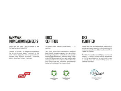 Hergestellt aus 100 % ringgesponnener, gekämmter Bio-Baumwolle und vom Global Organic Textile Standard (GOTS) zugelassen.
