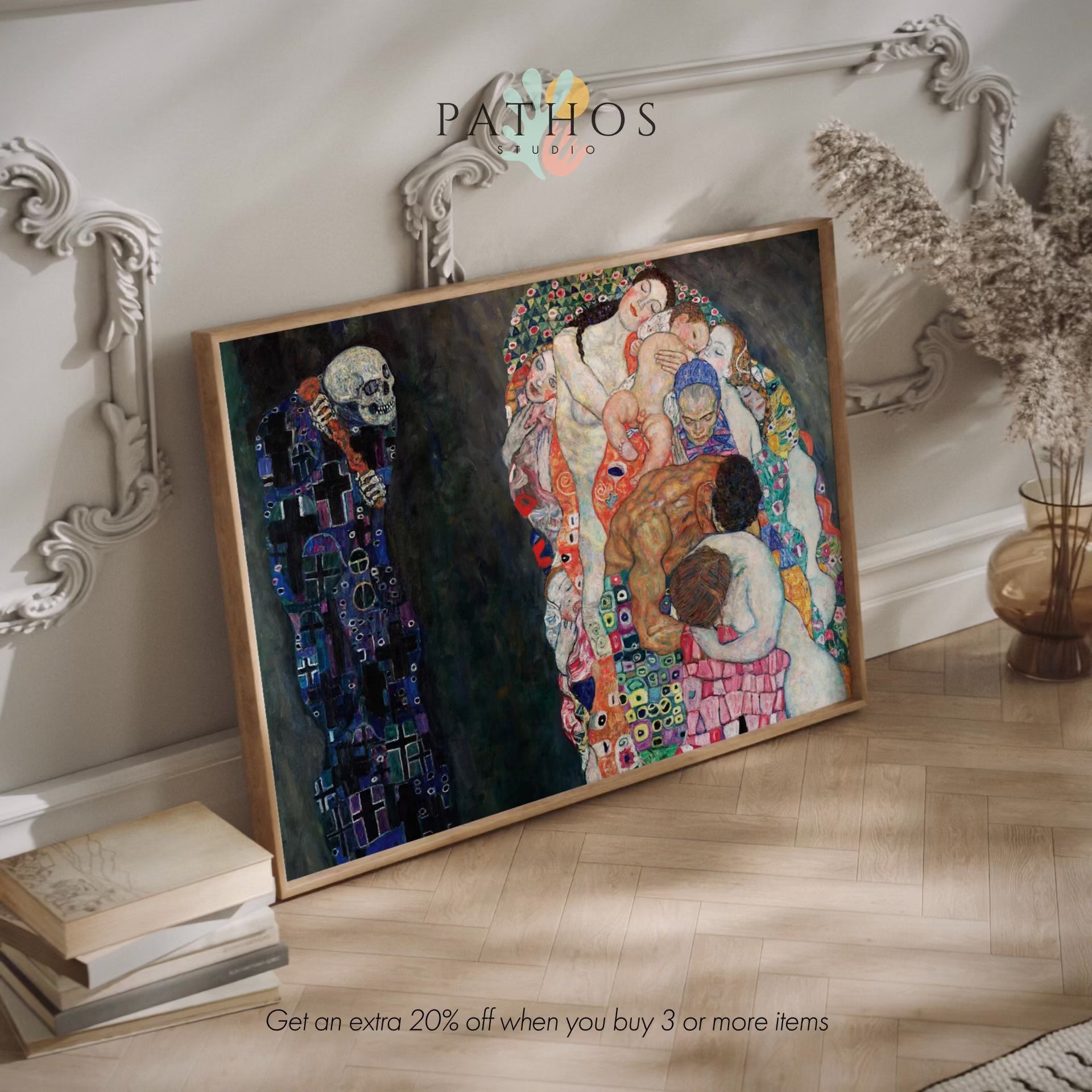 Gustav Klimts klassische Öl-auf-Leinwand-Gemälde mit dem Titel „Tod und Leben“, erhältlich als Premium-Giclée-Druck und mit verschiedenen Rahmenoptionen.