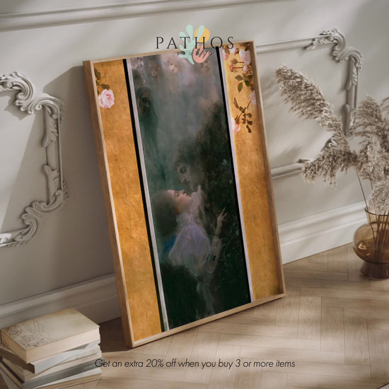 Gustav Klimts klassisches Öl-auf-Leinwand-Gemälde mit dem Titel „Liebe“, das als hochwertiger Giclée-Kunstdruck mit einer breiten Palette an Rahmenoptionen bestellt werden kann.