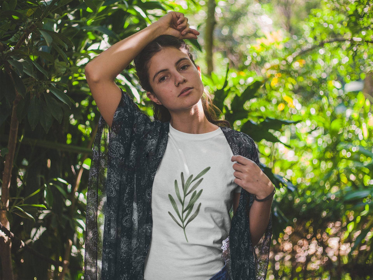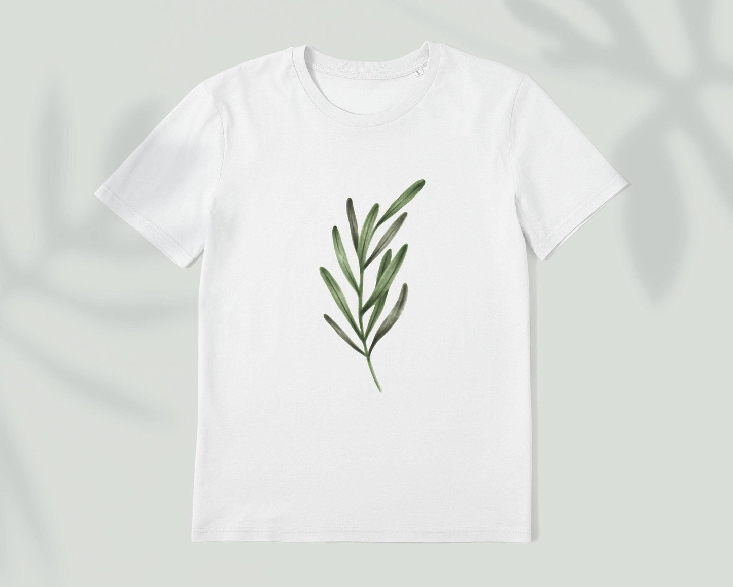 Unser charakteristisches Unisex-T-Shirt mit einem illustrierten Pflanzenblatt.