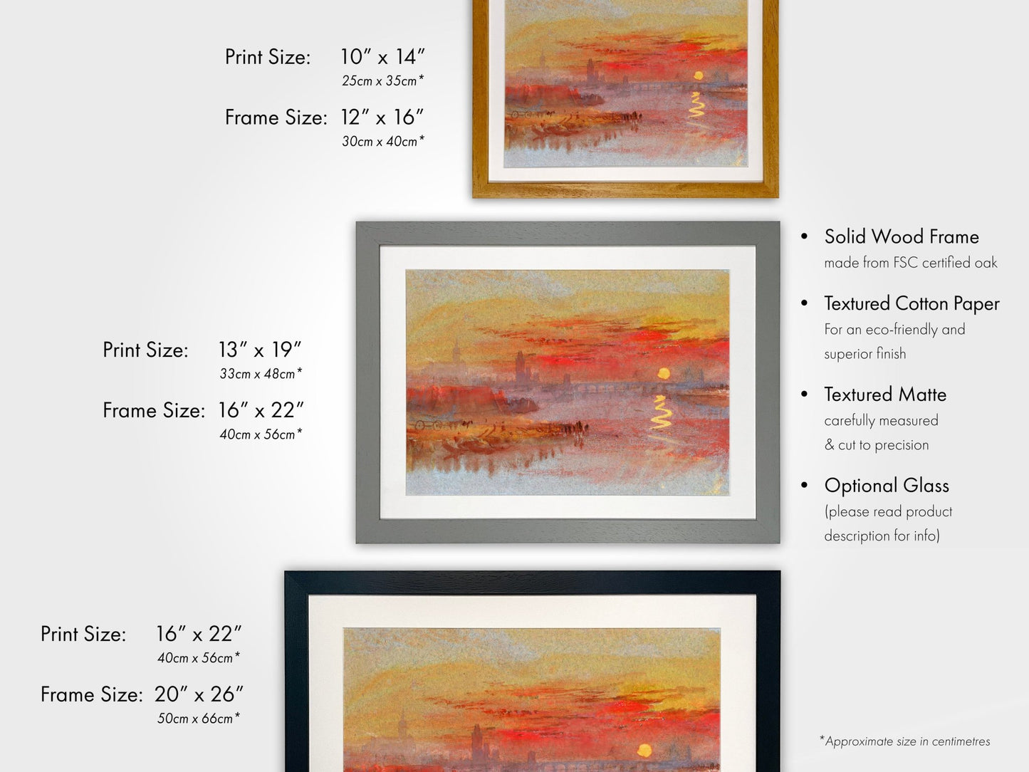 Drucke können auch in maßgeschneiderten Holzrahmen mit strukturiertem, mattem Rand und authentischem Glasfenster bestellt werden. Sie sind in einer Vielzahl von Ausführungen in den folgenden Größen erhältlich: