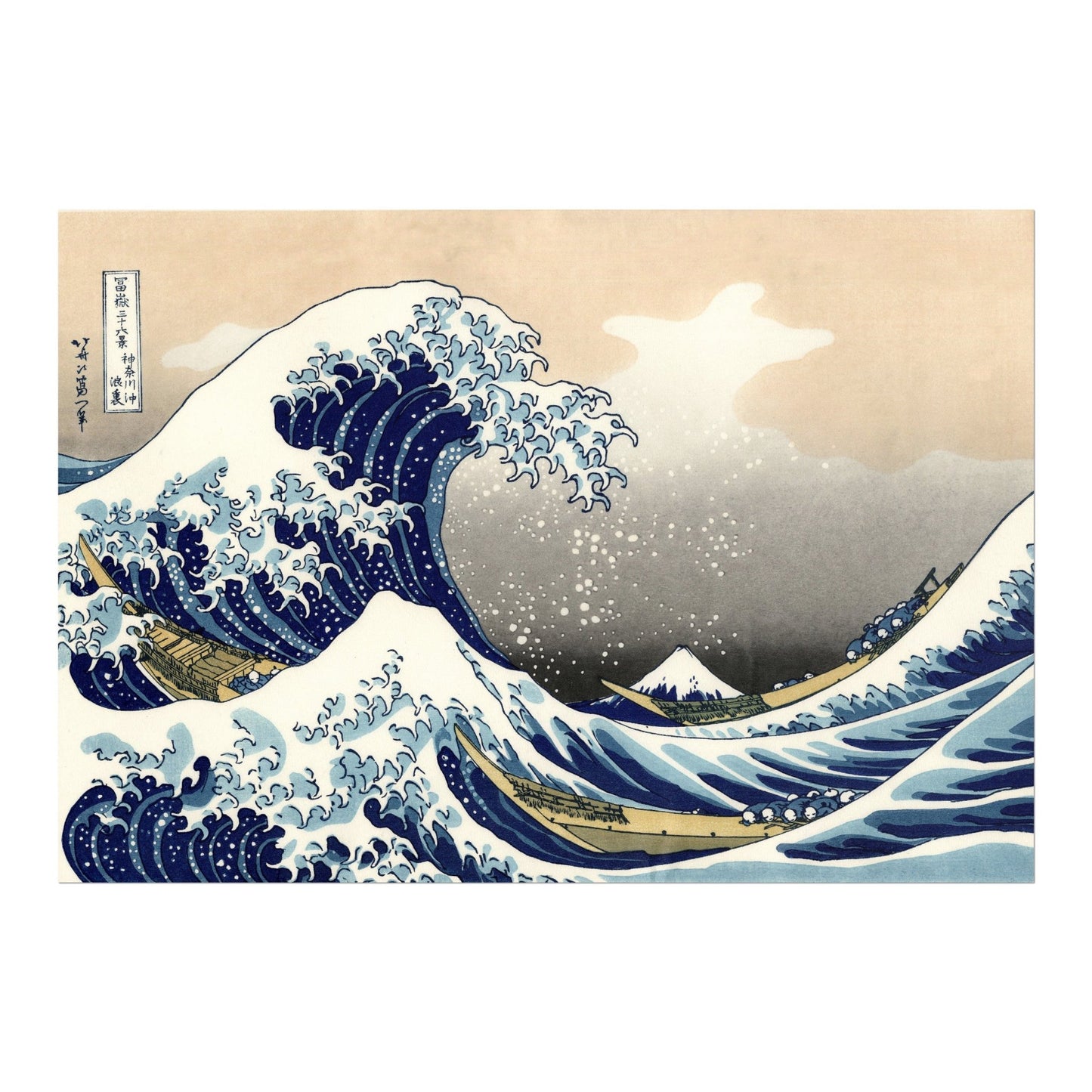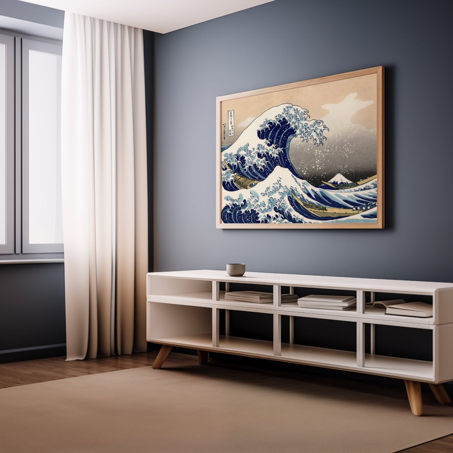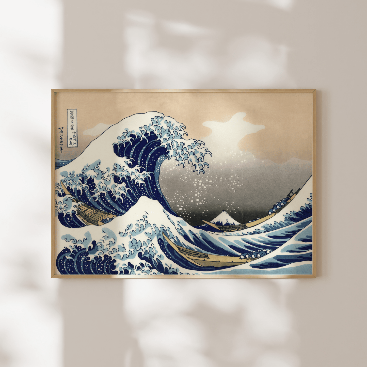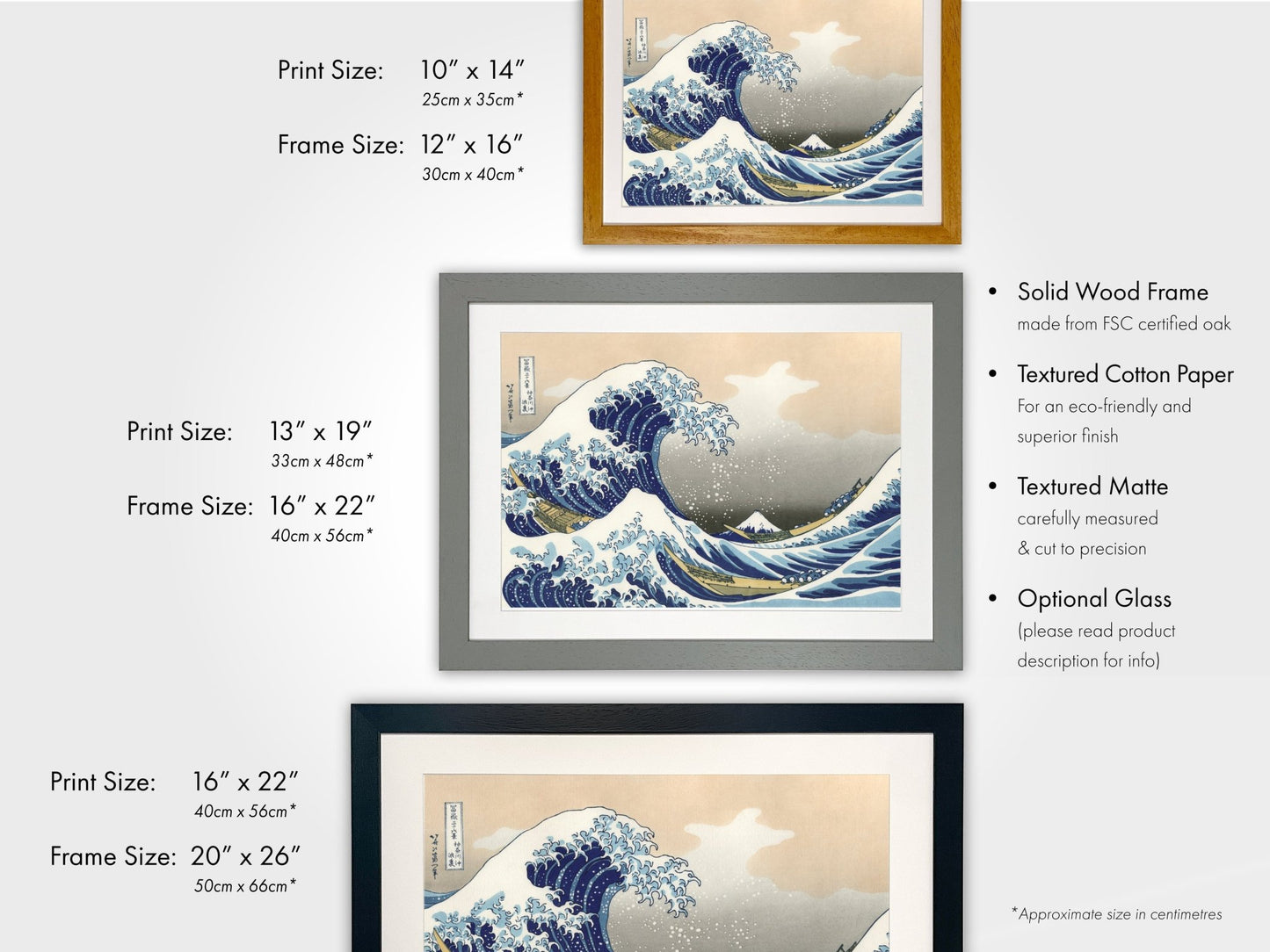Katsushika Hokusais klassischer Holzschnitt „Die große Welle vor Kanagawa“ aus dem 19. Jahrhundert kann als hochwertiger Giclée-Kunstdruck mit einer großen Auswahl an Rahmenoptionen bestellt werden.