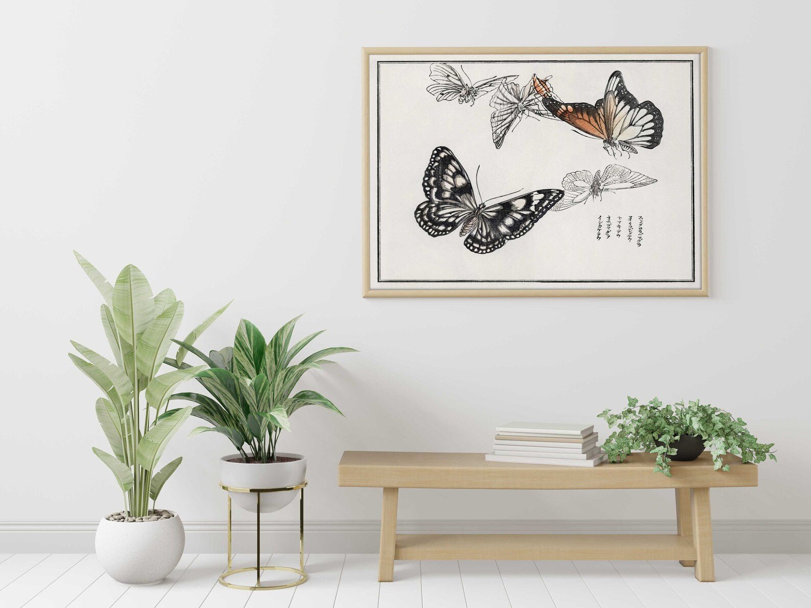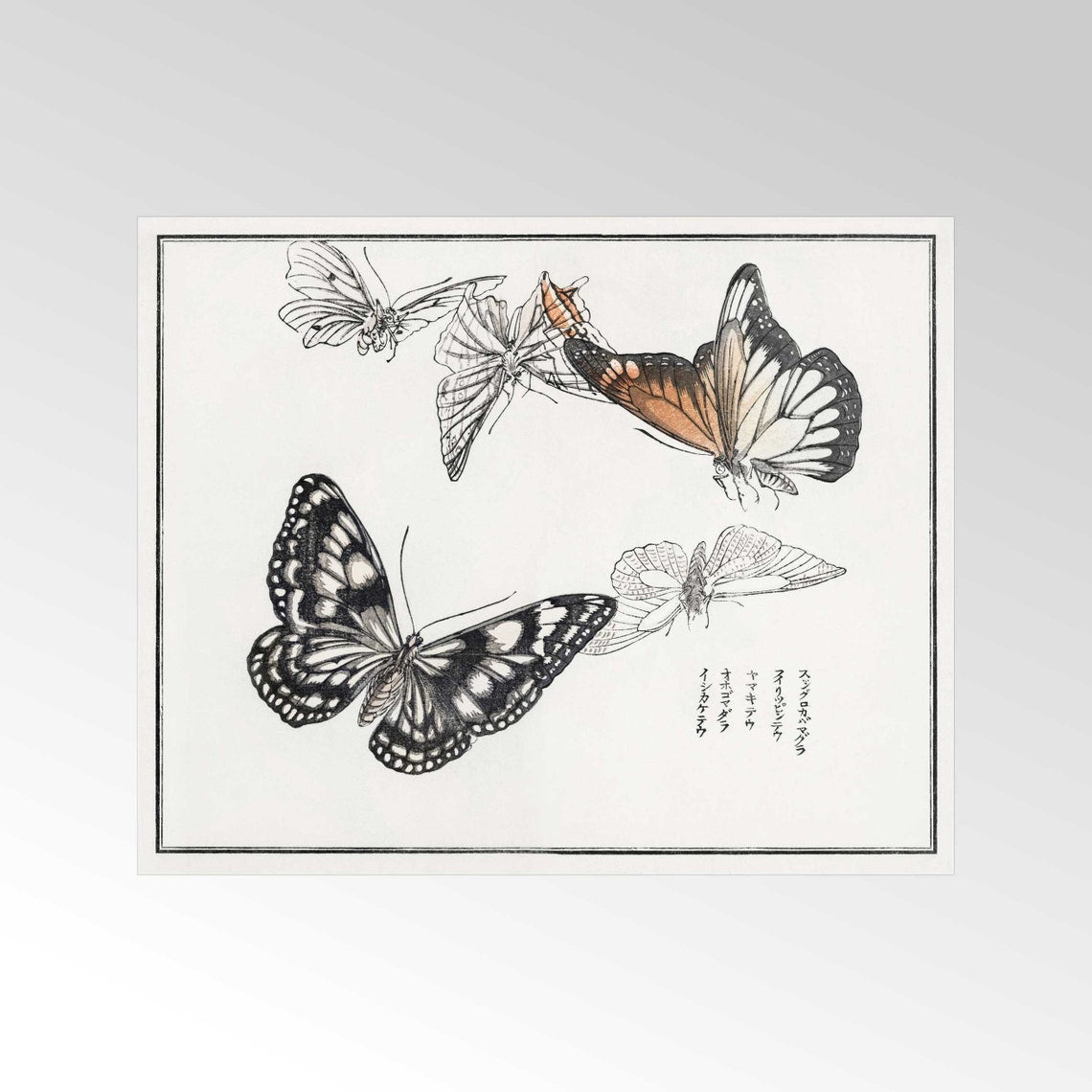Morimoto Tokos klassische Holzschnittillustration „Schmetterlinge“ aus dem 20. Jahrhundert, erhältlich als hochwertiger Giclée-Kunstdruck mit einer breiten Palette an Rahmenoptionen.