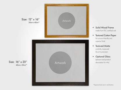 Alle Druckprodukte werden ausschließlich mit veganen Farben hergestellt und für unsere Holzrahmen verwenden wir ausschließlich FSC-zertifiziertes Eichenholz.