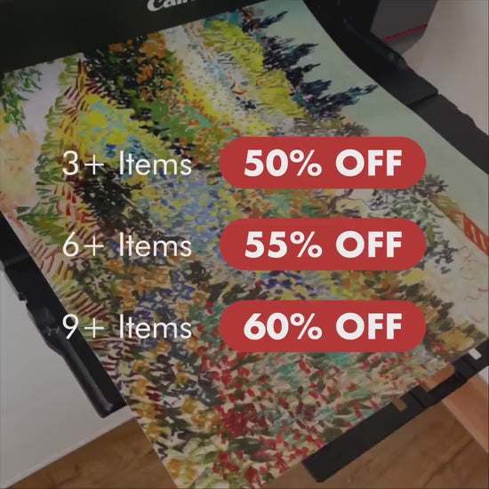 Randlos gedruckt mit einer breiten Palette veganer und archivarischer Pigmenttinten für Lichtbeständigkeit und Langlebigkeit des Drucks.