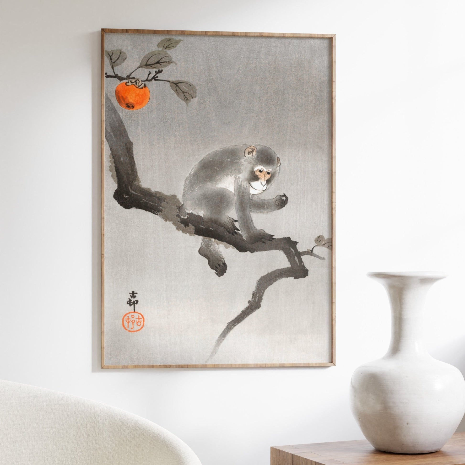 L'illustration classique de gravure sur bois du XXe siècle d'Ohara Koson « Monkey in Cockatoo », disponible sur commande en tant qu'impression d'art giclée haut de gamme avec une large gamme d'options de cadrage.