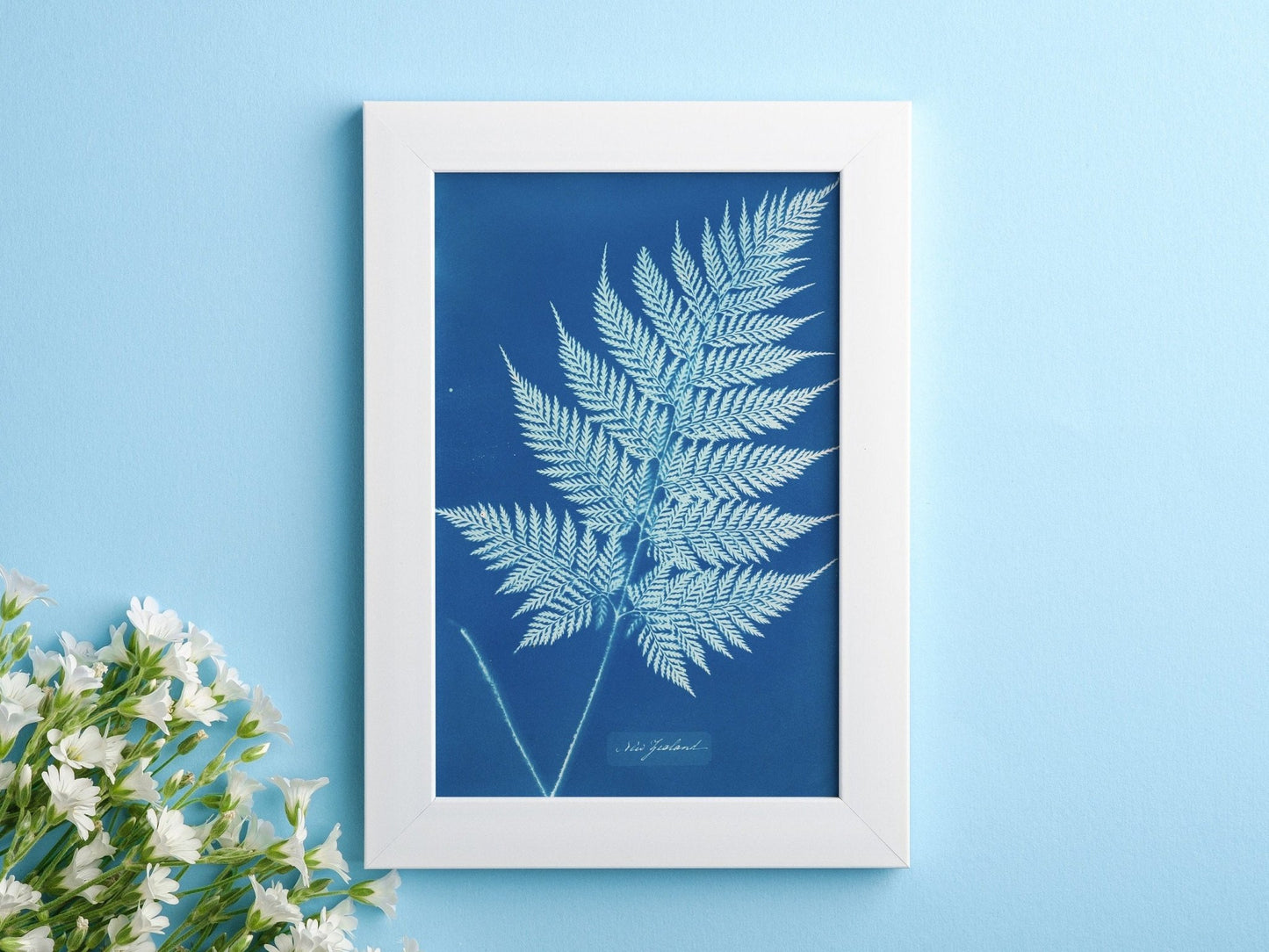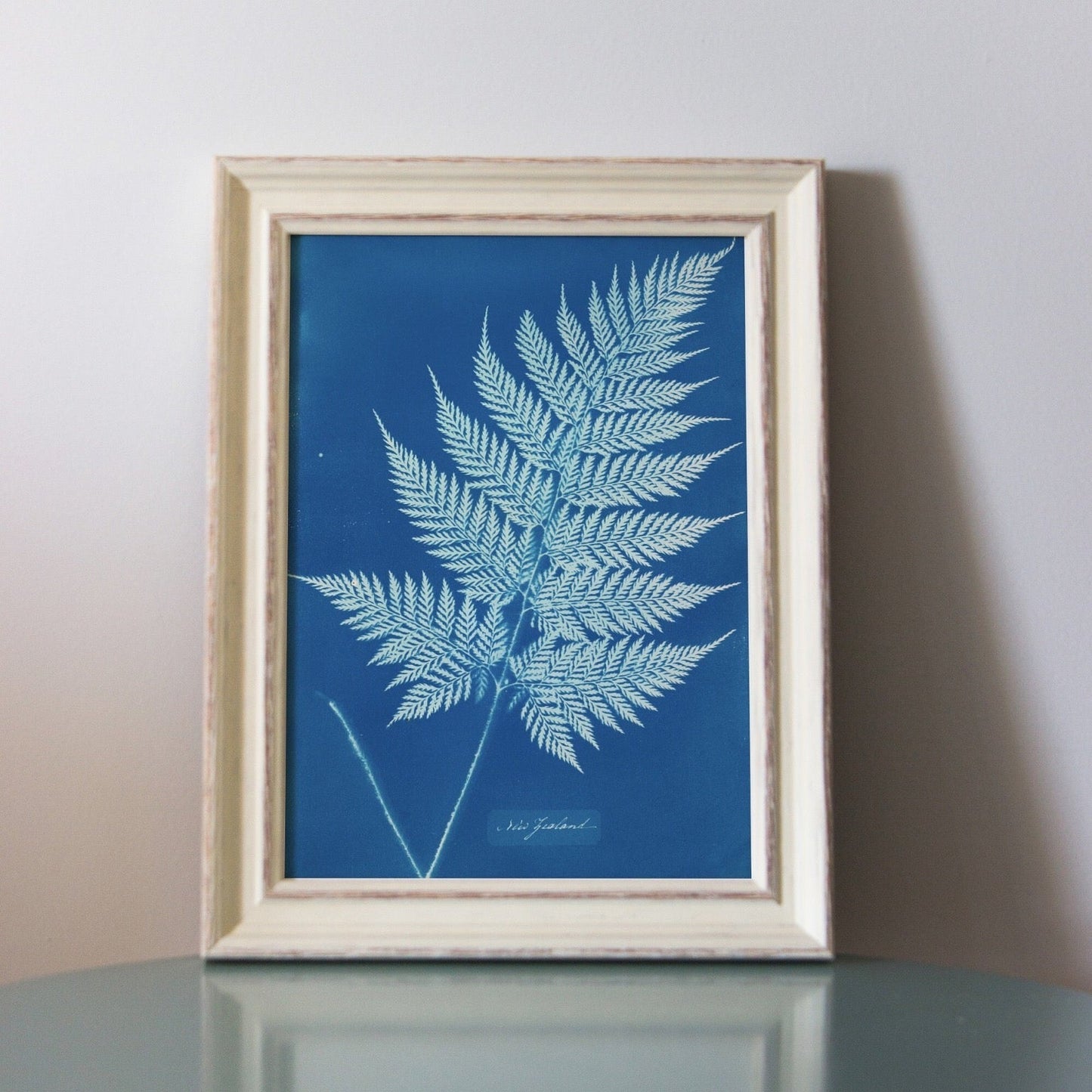 A classic botanical photography by Anna Atkins titled 'Fern-Like Leaf Frond', available as a giclée art print and with a variety of frame options to choose from.