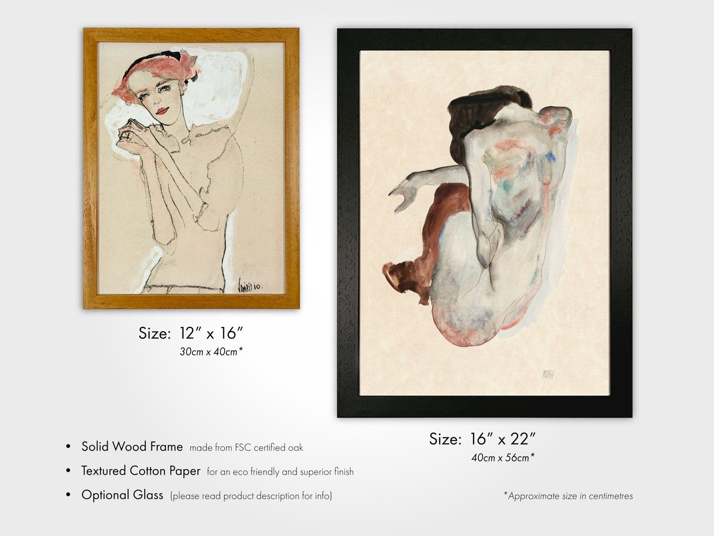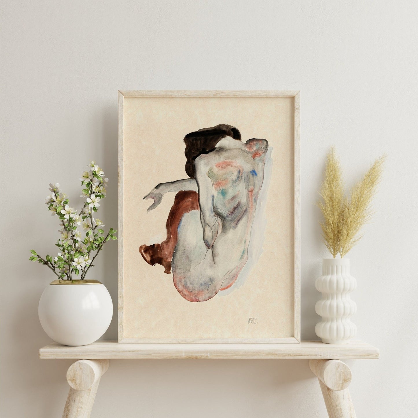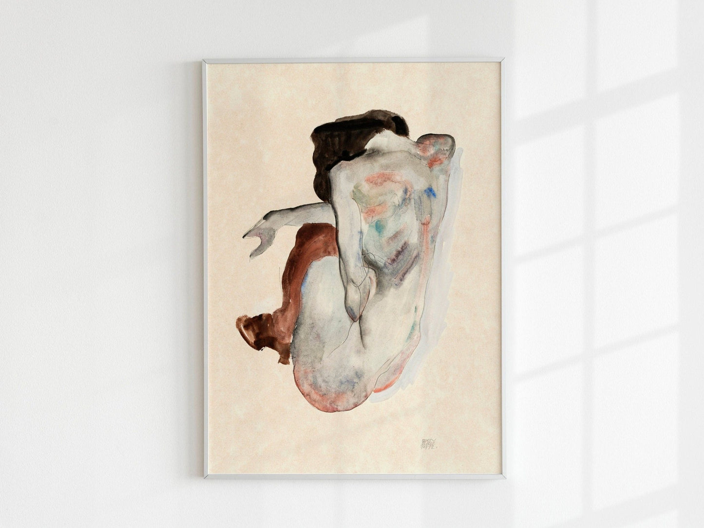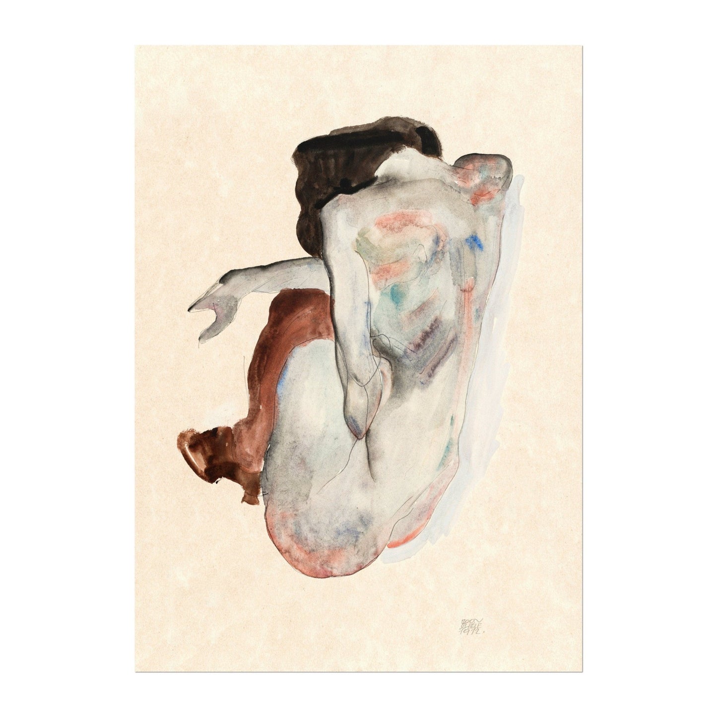Egon Schiele's classic 'Crouching Nude in Shoes and Black Stockings, Back View', available as a giclée print and with a variety of framing options.