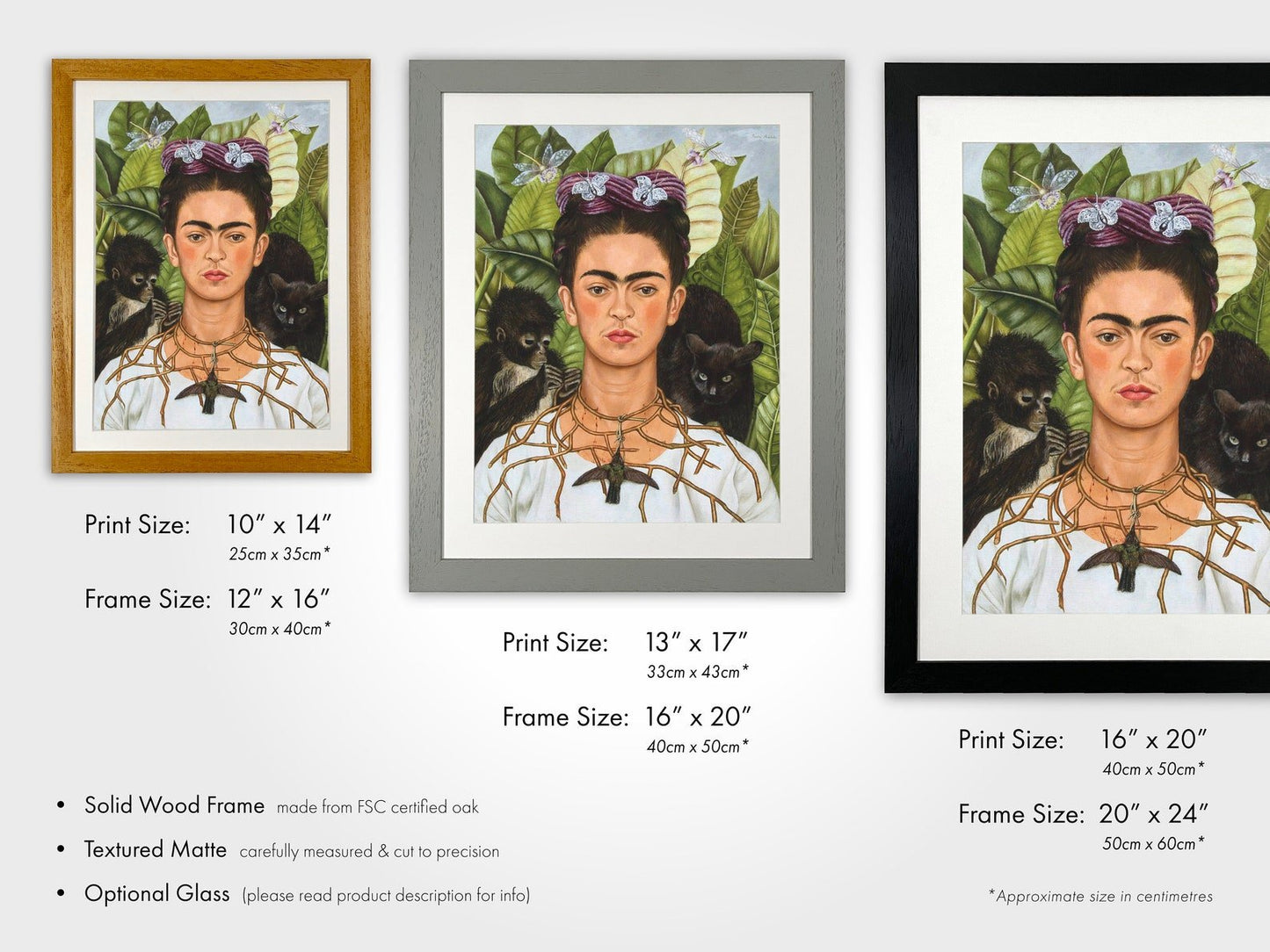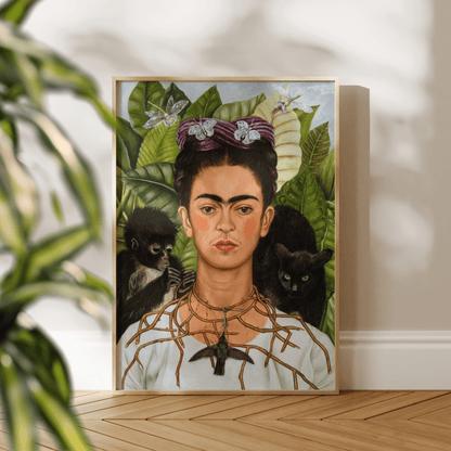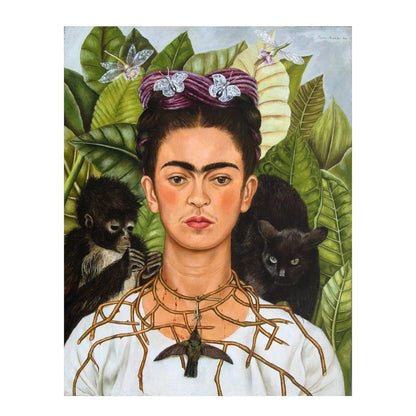 Frida Kahlo's classic oil-on-canvas painting titled 'Self-Portrait with Thorn Necklace & Hummingbird', available to order as a premium giclée art print with a wide range of framing options.