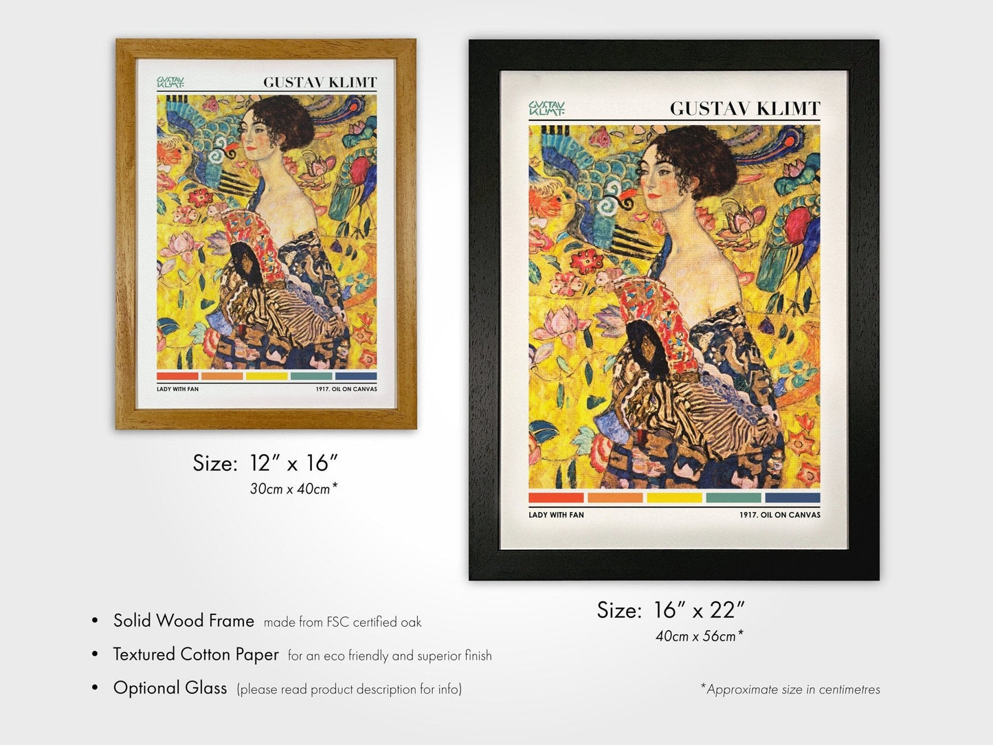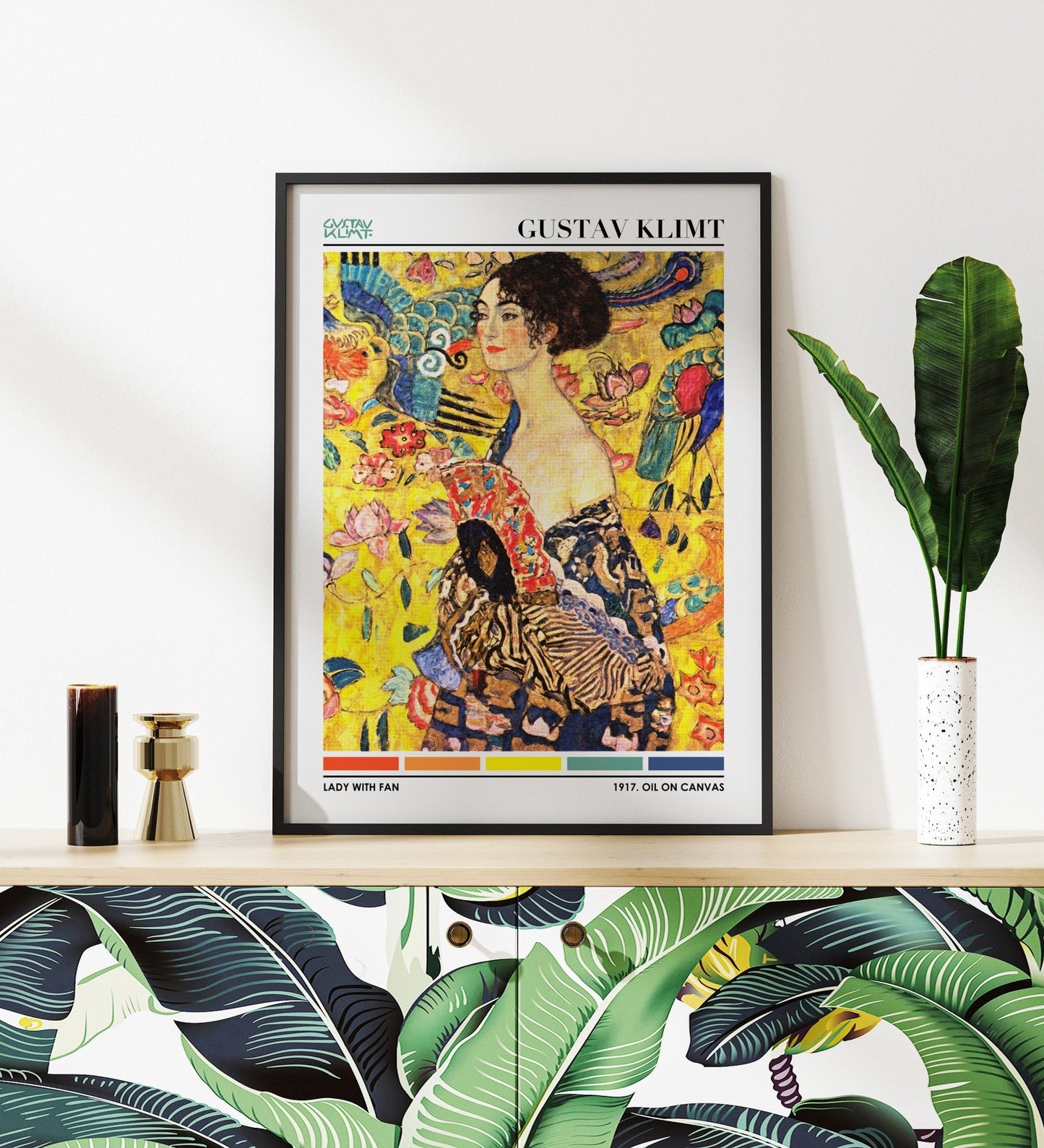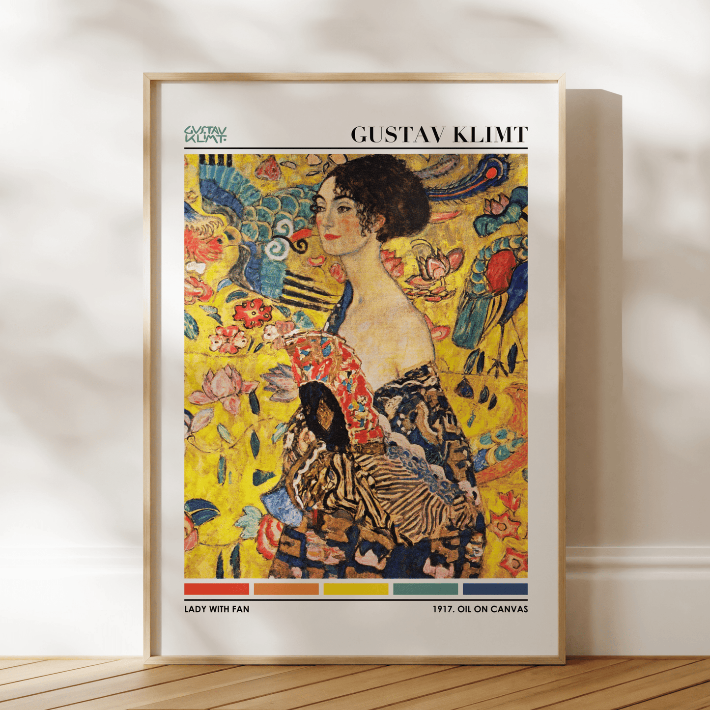 Gustav Klimt's classic 'Lady With Fan', reimagined as a modern poster highlighting the painting's colour palette.