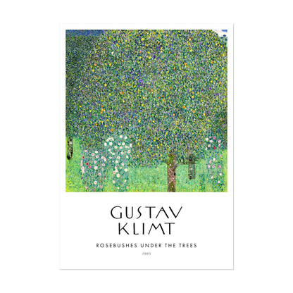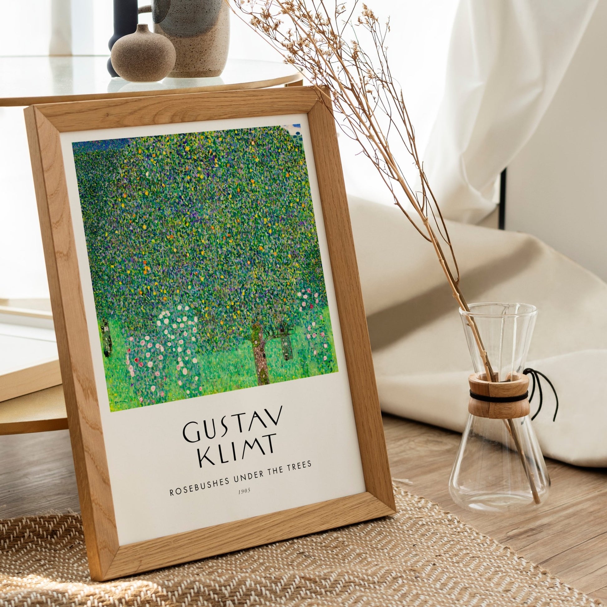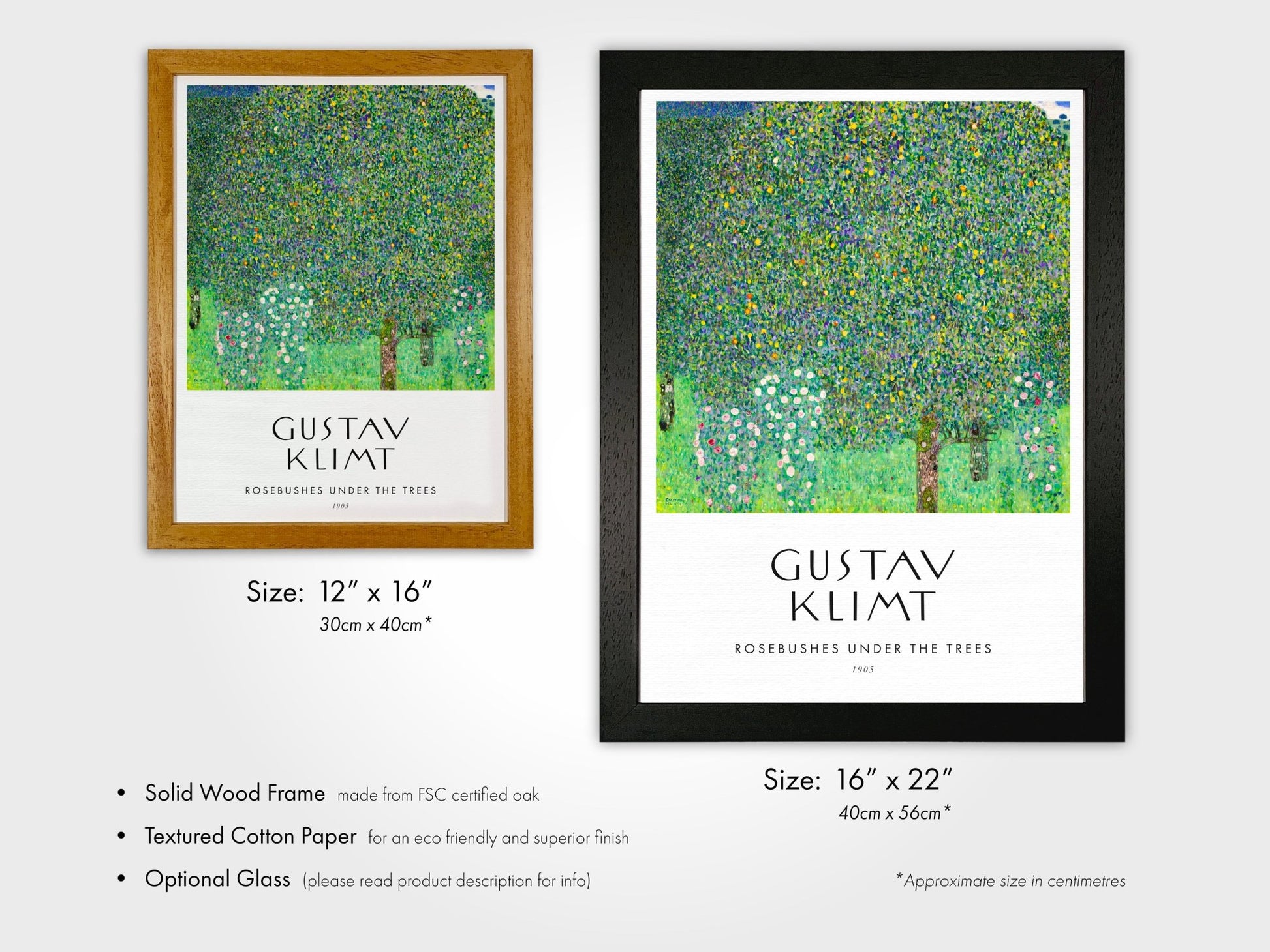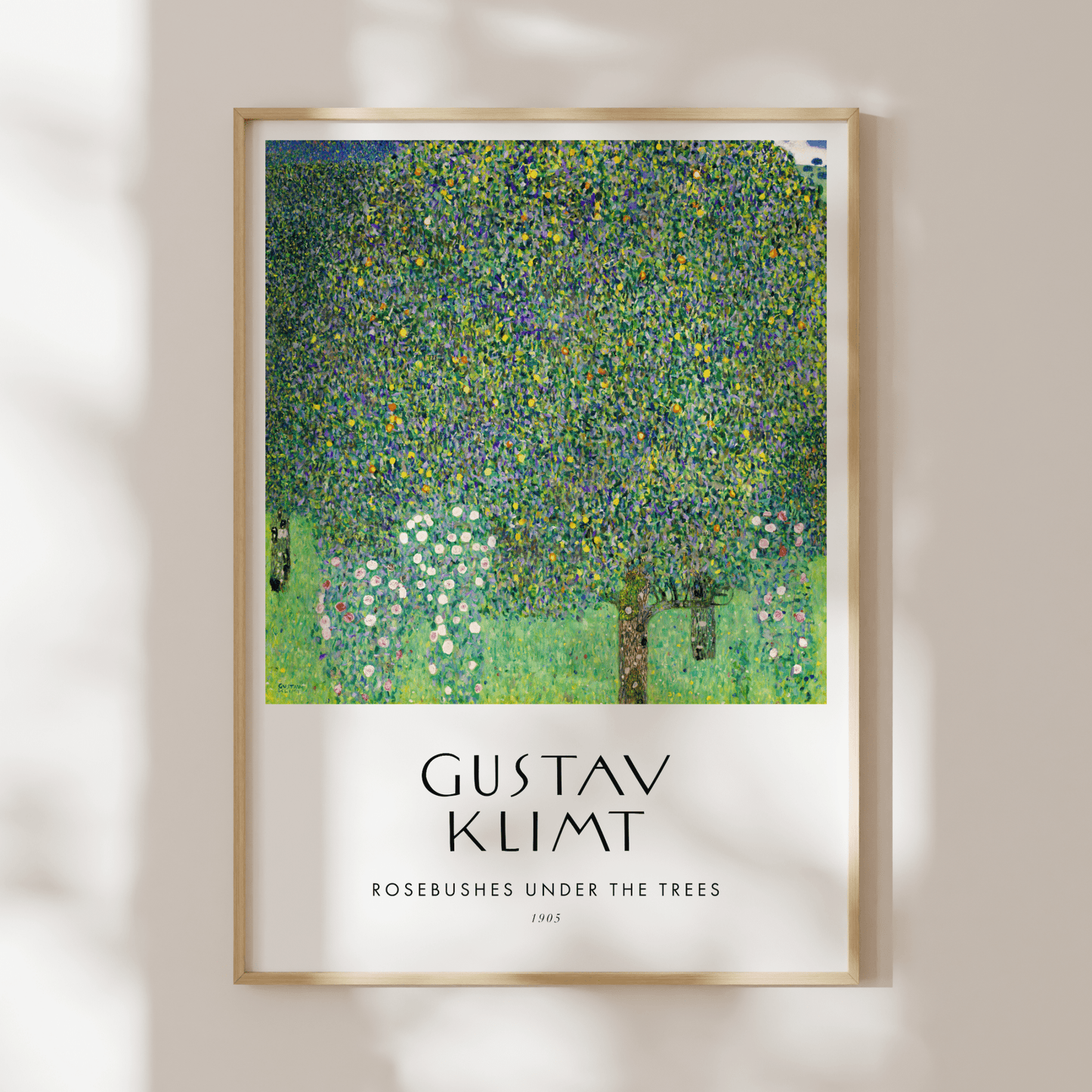 An exclusive poster design created in-house, featuring Gustav Klimt’s classic ‘Rosebushes Under The Trees,’ available to order as a premium giclée art print with a wide range of framing options.