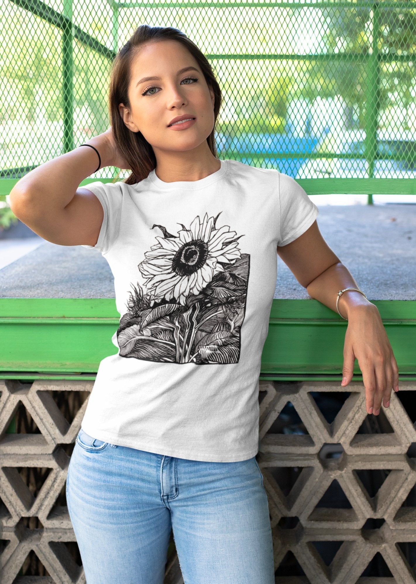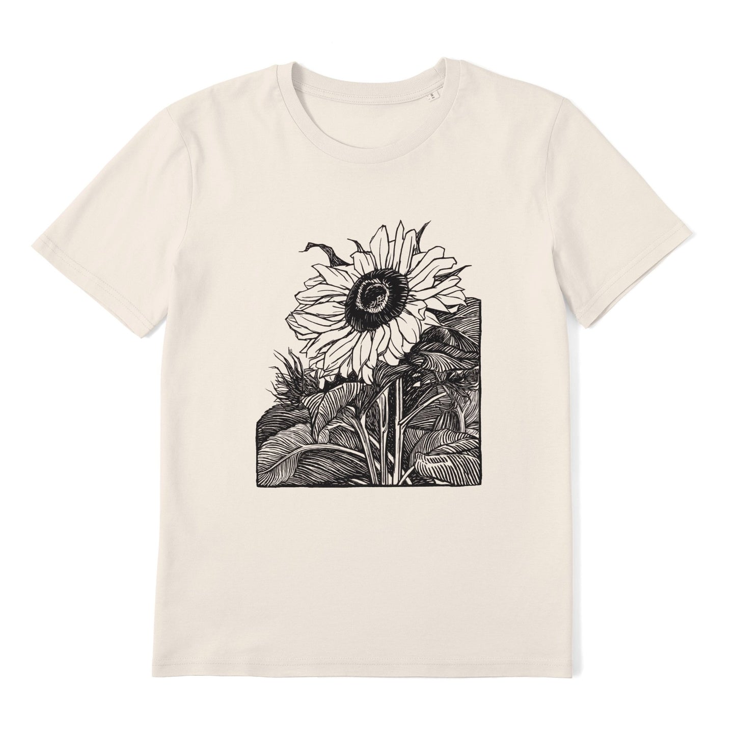 Our signature unisex T-Shirt featuring a linoprint titled 'Sunflower' by Julie De Graag.