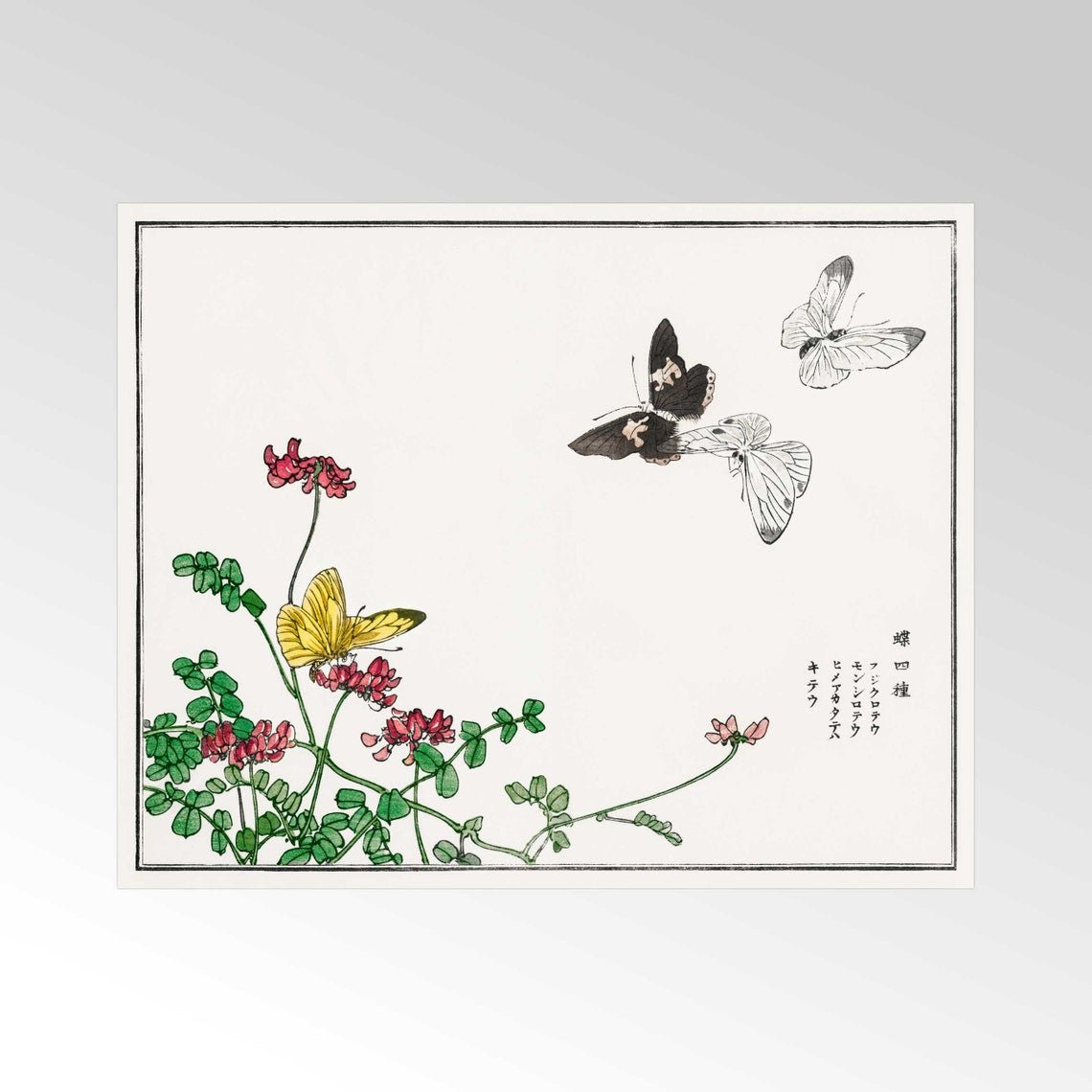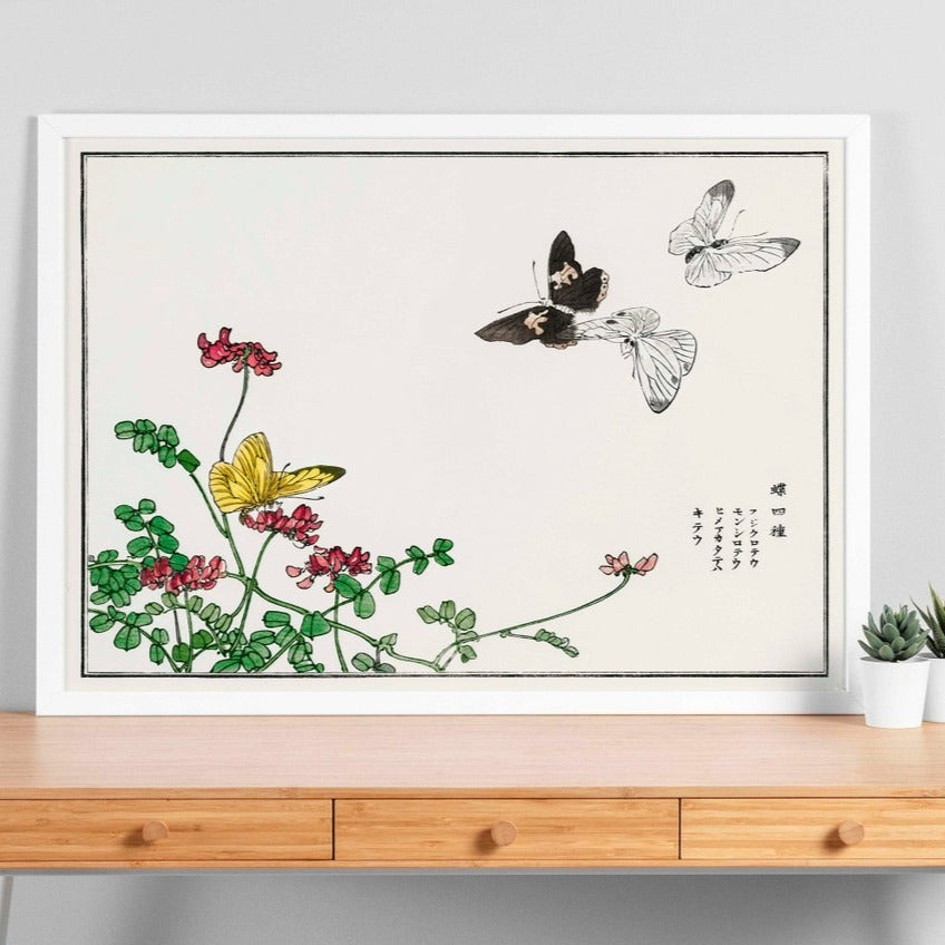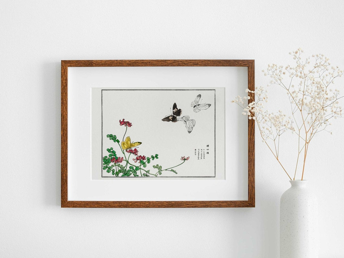 Morimoto Toko’s classic 20th Century woodblock illustration 'Butterflies and Flower', available to order as a premium giclée art print with a wide range of framing options.