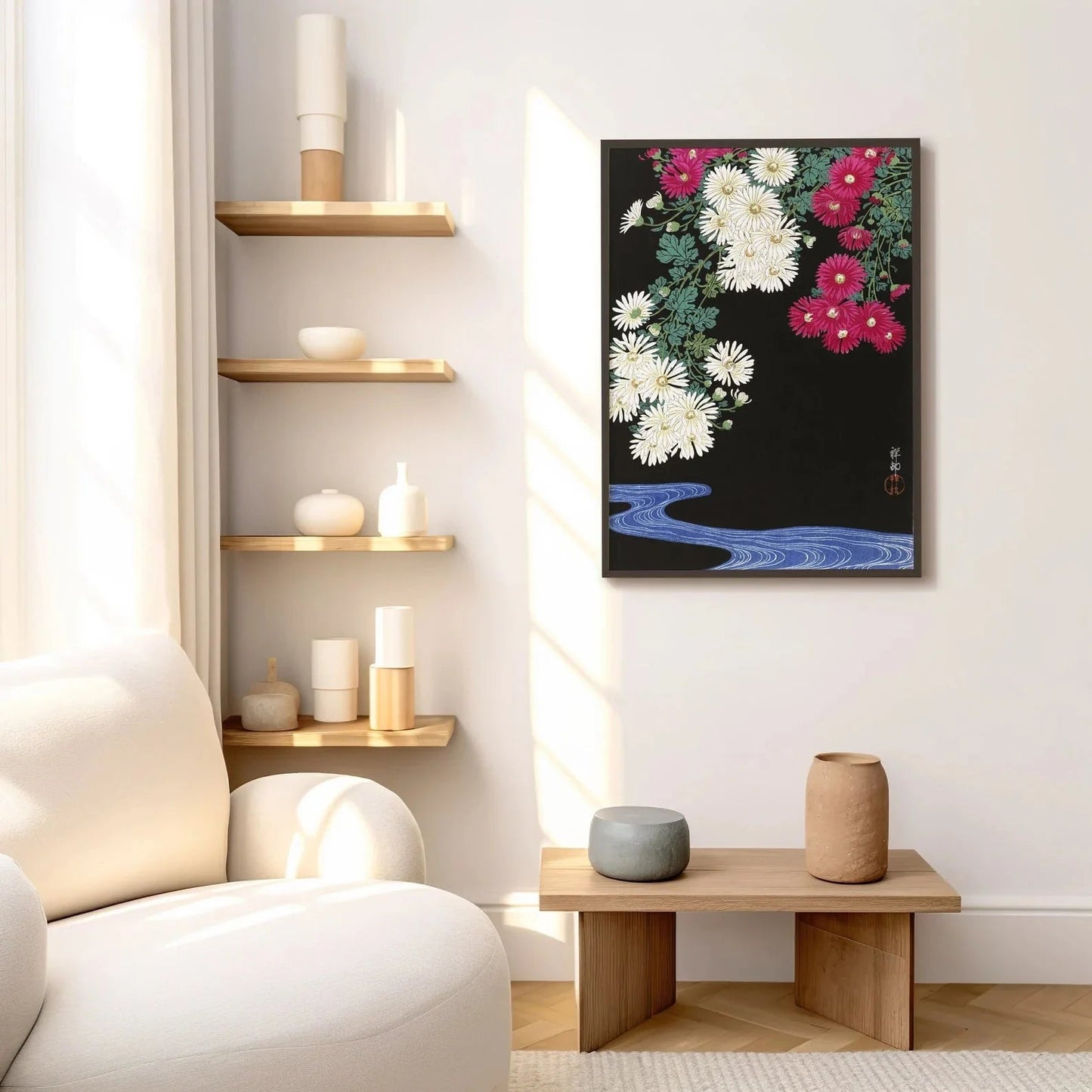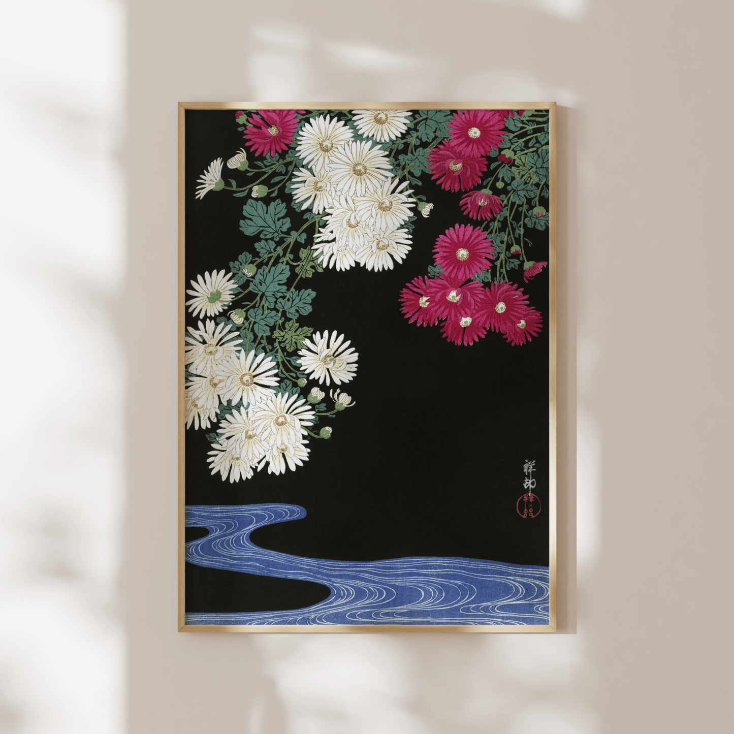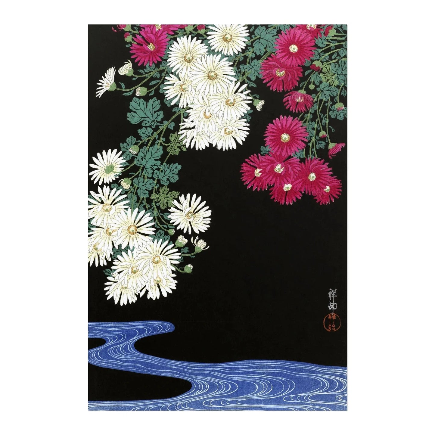 Ohara Koson's classic 20th Century woodblock illustration 'Chrysanthemums', available to order as a premium giclée art print with a wide range of framing options.
