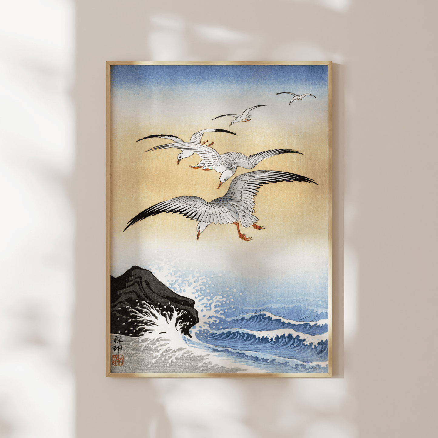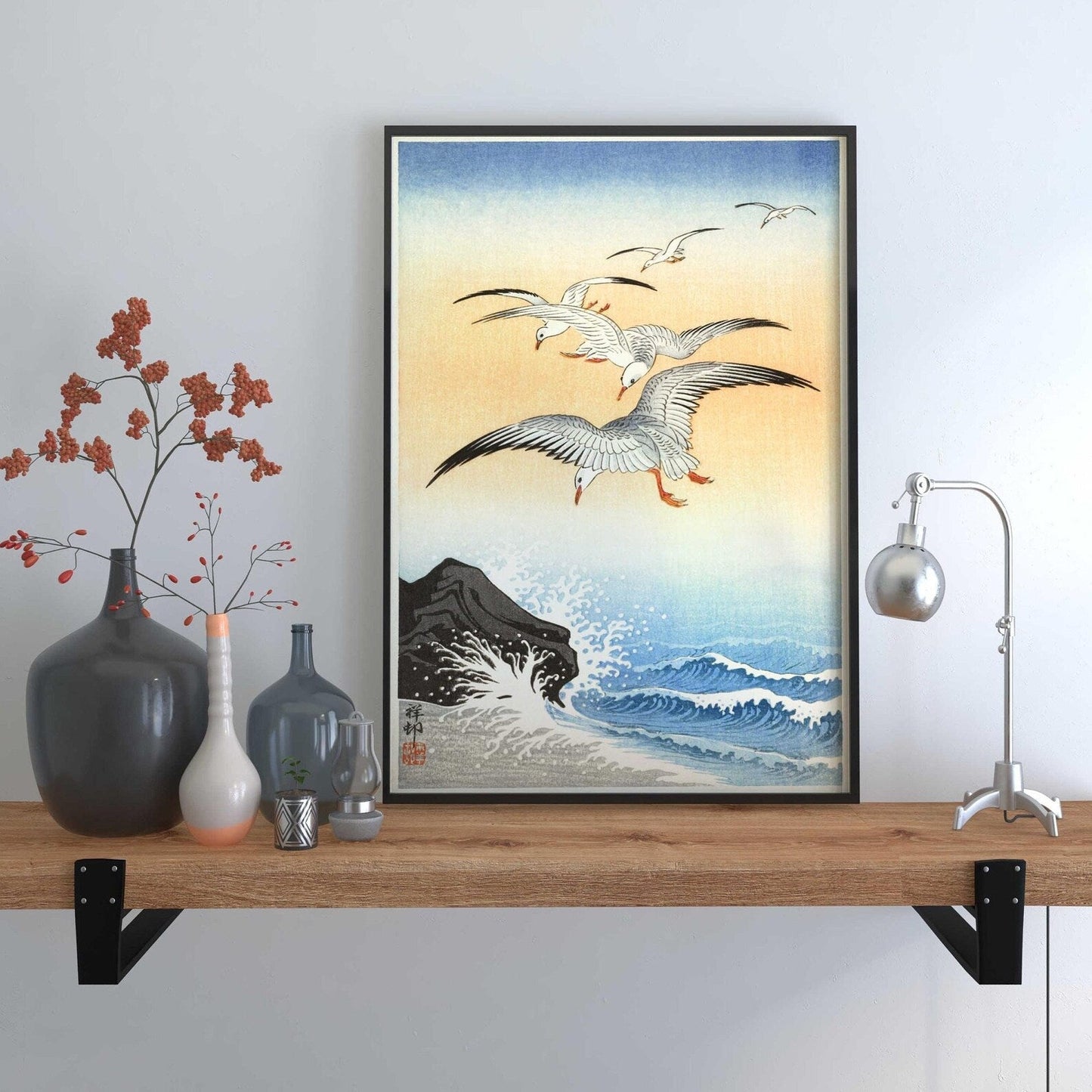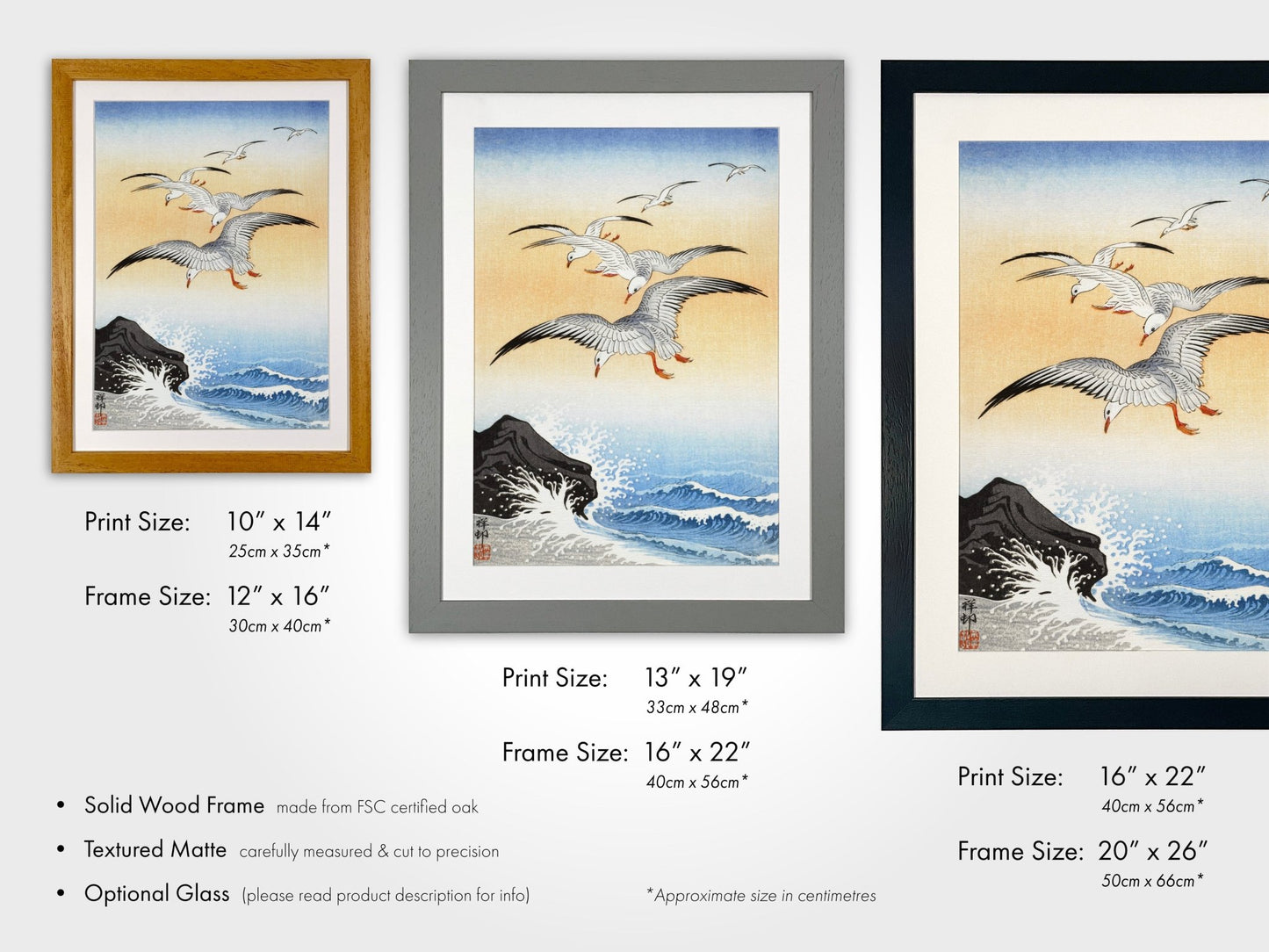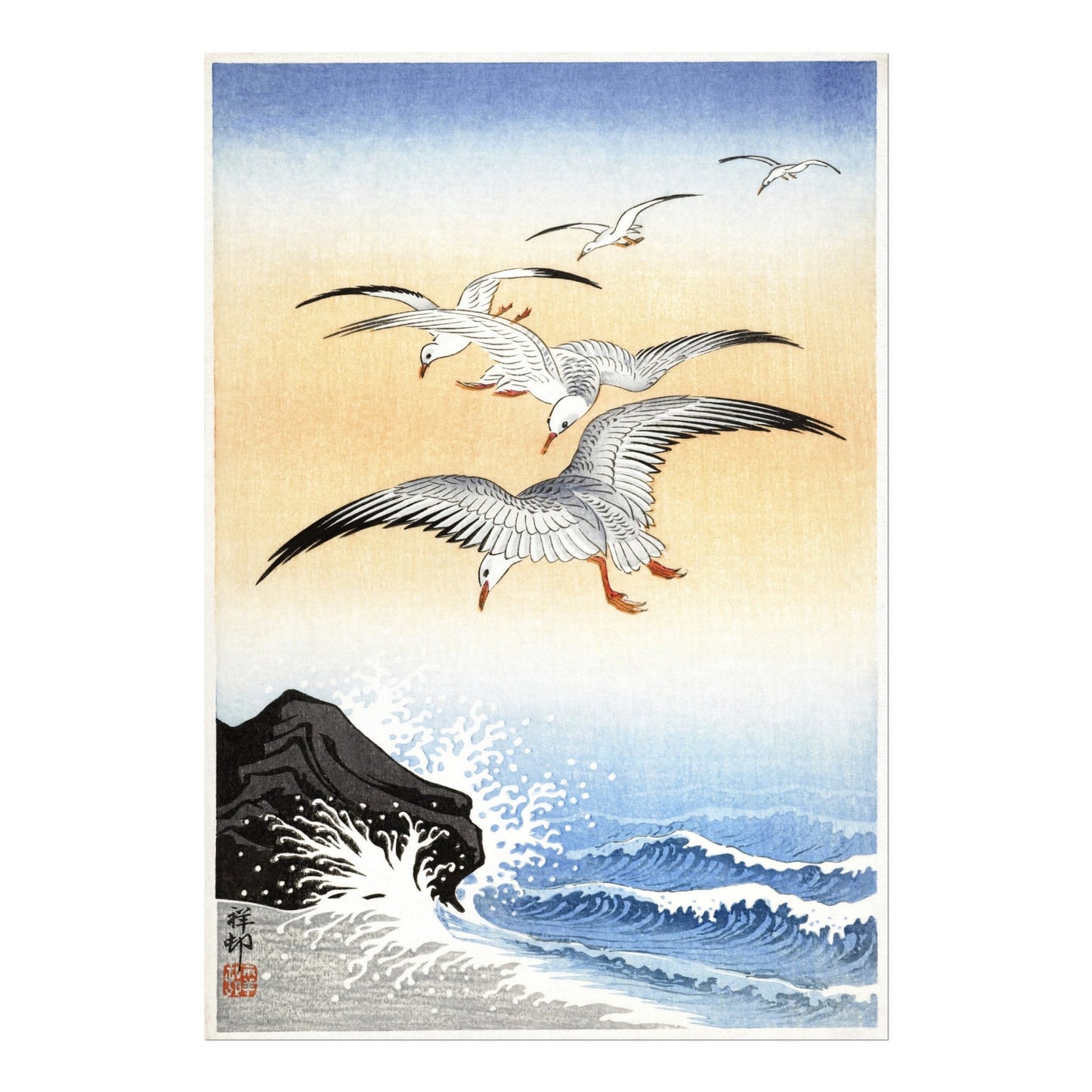 Ohara Koson's classic 20th Century woodblock illustration 'Five Seagulls Above Turbulent Sea ', available to order as a premium giclée art print with a wide range of framing options.