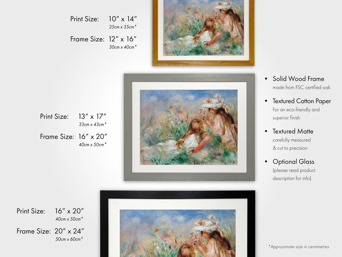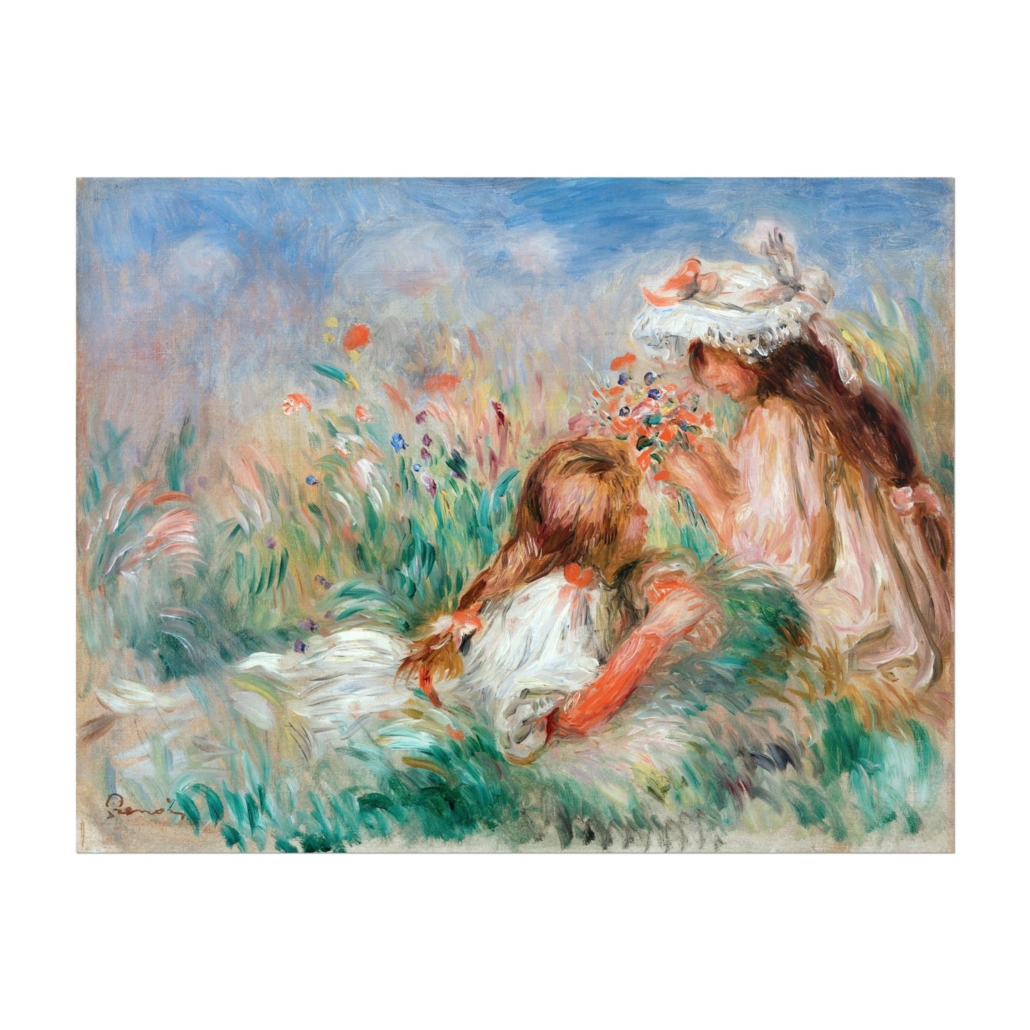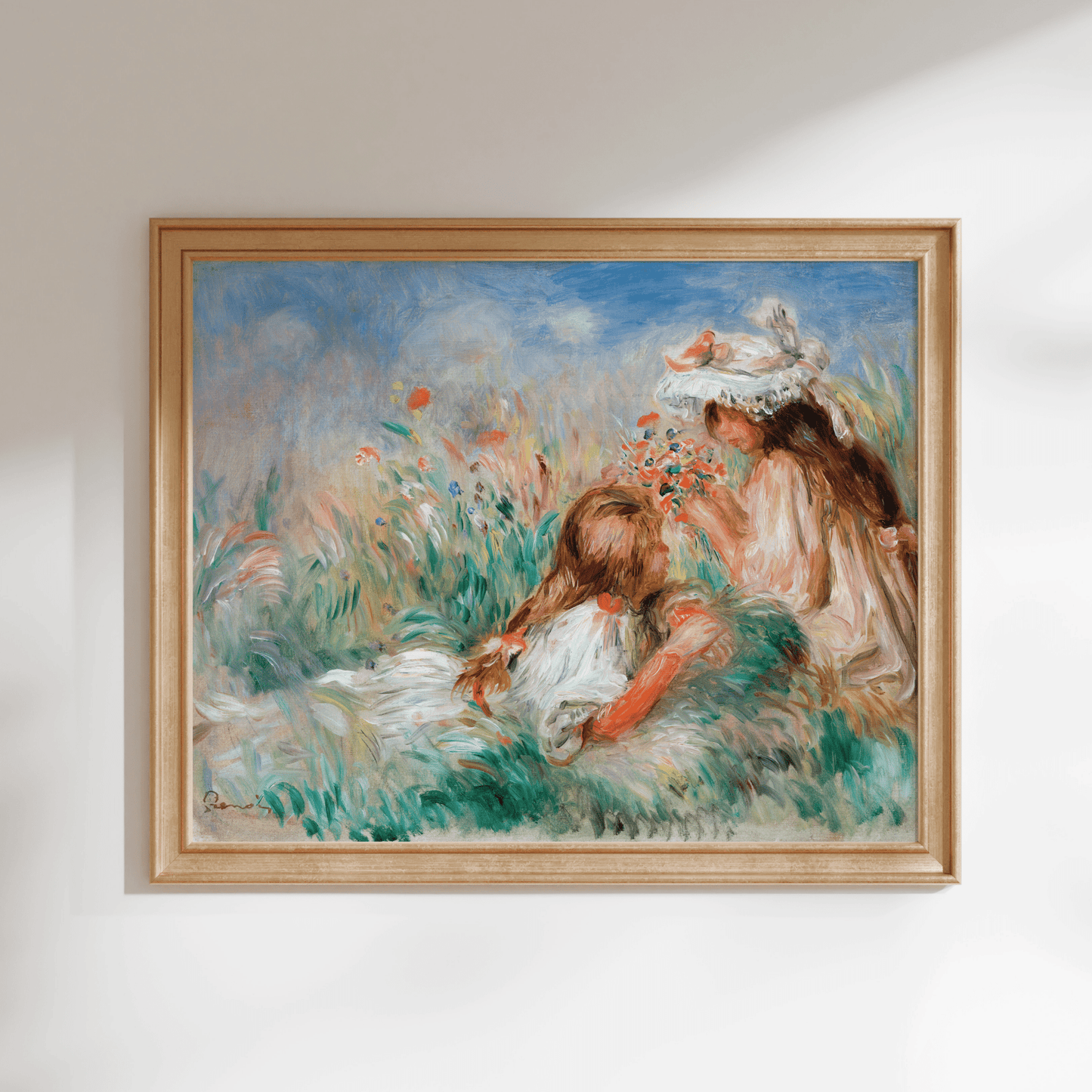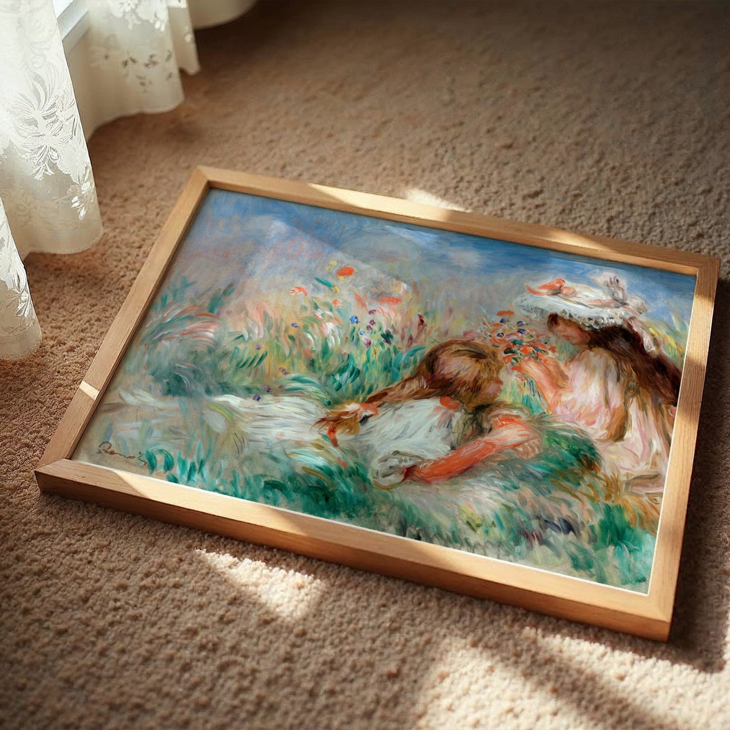 Pierre-Auguste Renoir’s classic oil-on-canvas painting 'Girls in the Grass Arranging a Bouquet', available as a high resolution giclée print in a variety of sizes.
