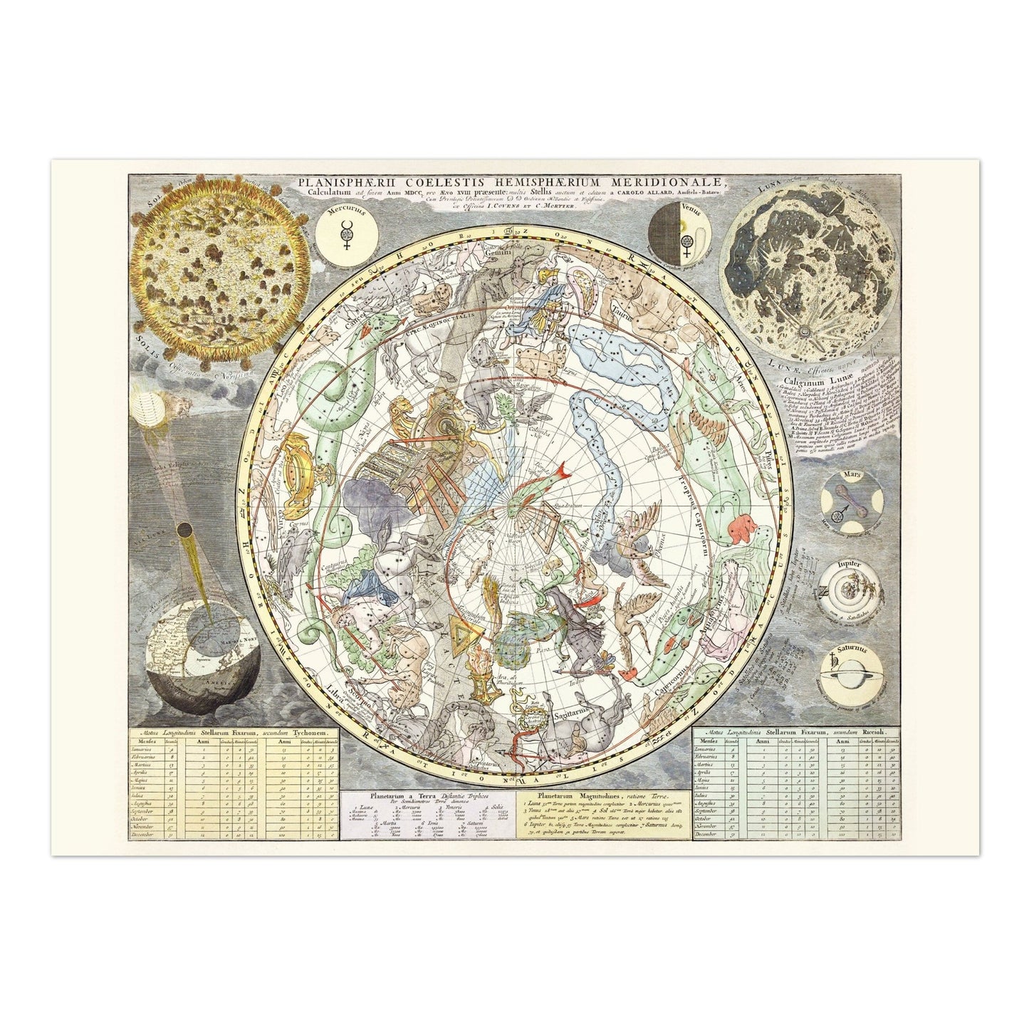 An antique illustration titled 'Sterrenkaart Van De Zuidelijke Sterrenhemel' (ca. 1722–1750) by Carel Allard, available as a high resolution print in a variety of bespoke sizes.